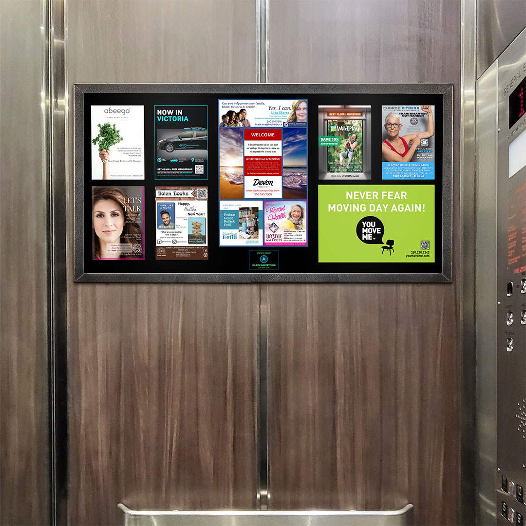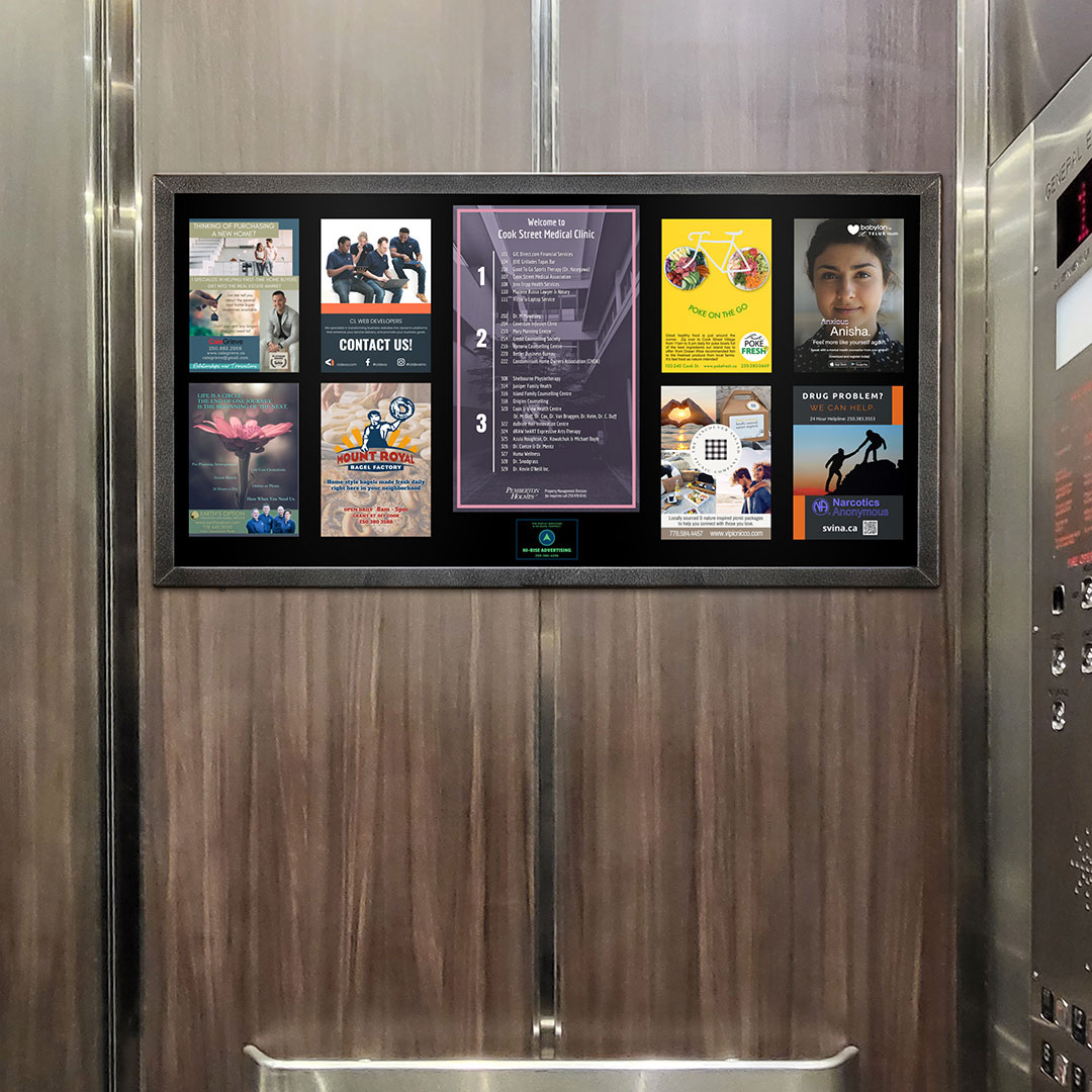 Generate top of mind brand awareness among thousands of elevator riders in residential apartments, office and medical buildings, and downtown parkades.