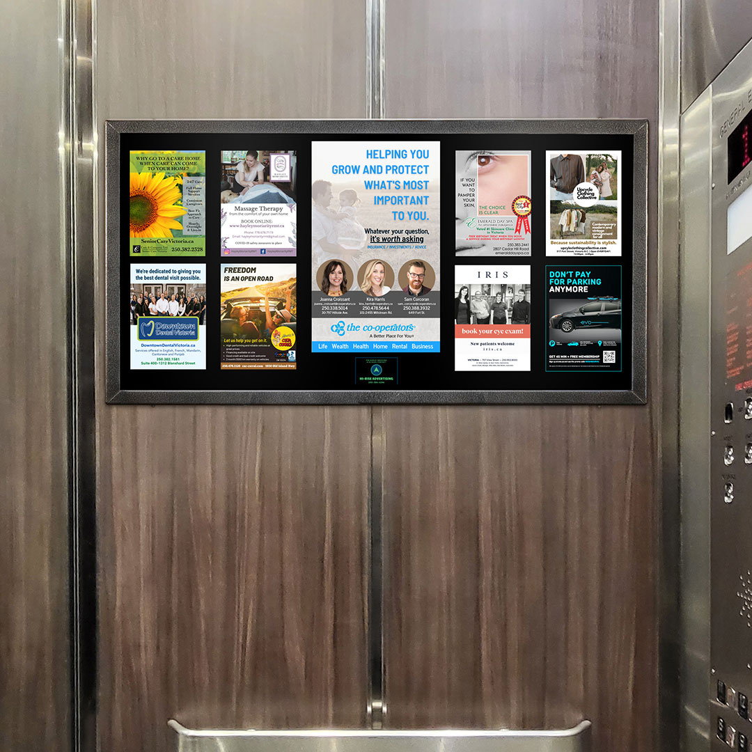 Hi-Rise Advertising believes in those who take good ideas and make them great! It is these innovators who are the foundation of our strong community and who are the driving factors in our economy. Our business supports these innovators by providing a platform which is absent of excessive clutter to express their unique vision. Through our elevator display platform, we can specifically tailor advertising packages to reach the most desirable audience for your product or service. Ads are posted for a month at a time and are rotated and updated within the first week of every month providing you with a full month of exposure.